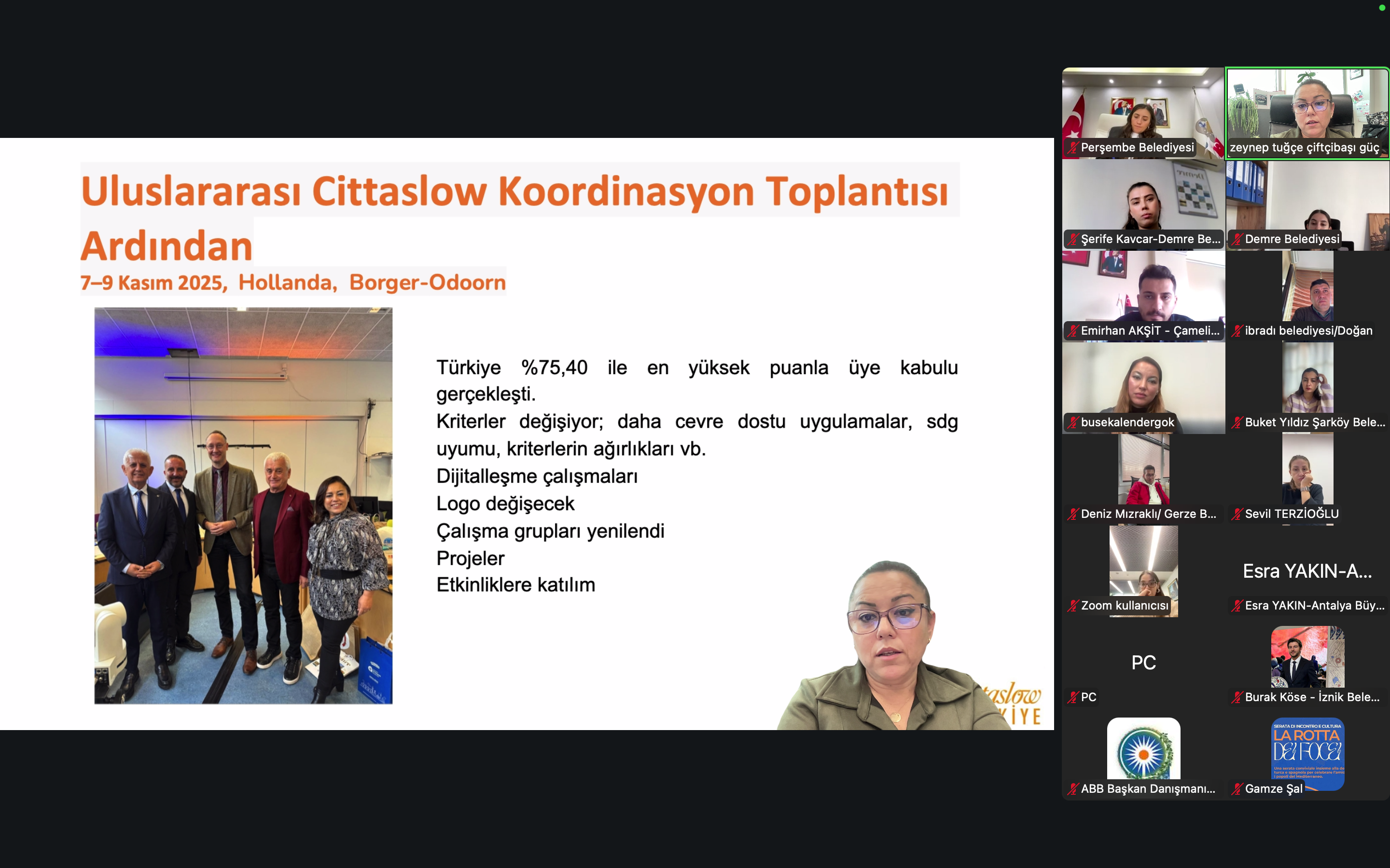 Toplantıda Cittaslow Türkiye Ekibinden M. Buse Kalender Gök, Safranbolu Ulusal Ağ Toplantısı sonrasında yürütülen çalışmalara dair sunum yaptı. Üye ziyaretlerinin Cittaslow Güdül ile başladığını belirten Kalender Gök, ziyaretlerin iletişimi güçlendirmek ve Cittaslow öğelerinin sürdürülebilirliğini yerinde gözlemlemek amacıyla devam edeceğini aktardı. Safranbolu’daki toplantının, iyi uygulama örnekleri ve turizm alanındaki katkılarıyla yıl içindeki faaliyetlerin değerlendirilmesinde önemli bir referans olduğu vurgulandı.