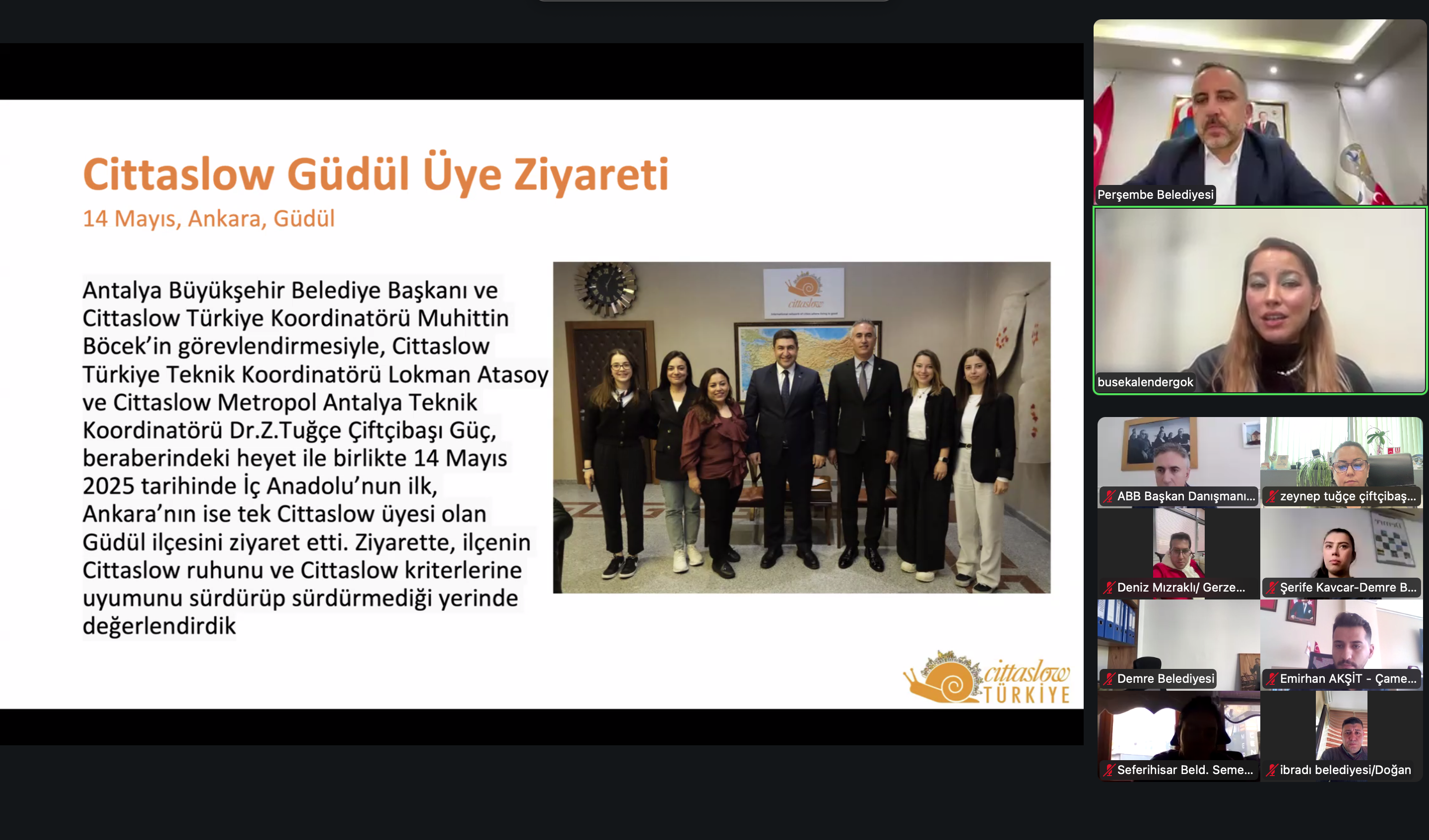 Toplantıda Cittaslow Türkiye Ekibinden M. Buse Kalender Gök, Safranbolu Ulusal Ağ Toplantısı sonrasında yürütülen çalışmalara dair sunum yaptı. Üye ziyaretlerinin Cittaslow Güdül ile başladığını belirten Kalender Gök, ziyaretlerin iletişimi güçlendirmek ve Cittaslow öğelerinin sürdürülebilirliğini yerinde gözlemlemek amacıyla devam edeceğini aktardı. Safranbolu’daki toplantının, iyi uygulama örnekleri ve turizm alanındaki katkılarıyla yıl içindeki faaliyetlerin değerlendirilmesinde önemli bir referans olduğu vurgulandı.